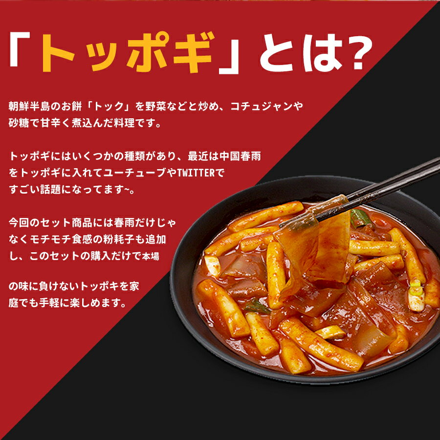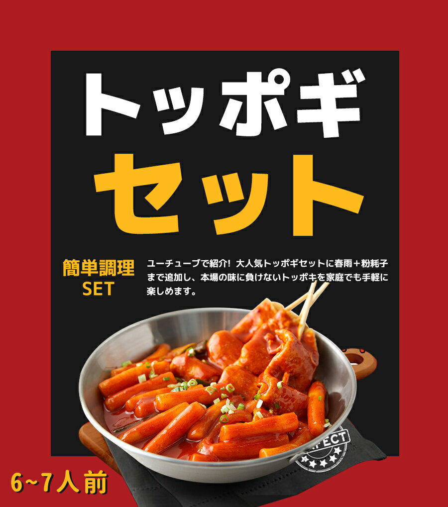 内容詳細 名 称 6種類入りトッポギセット 原材料名 ●カルボブルダック炒め麺 : 小麦粉、変性澱粉、パーム油、 ジャガイモ澱粉、精製塩、米糠S油、 麺類添加アルカリ剤(酸度調整剤)、グア-ガム、 トコフェロール混合粉末エス(デキストリン、 d-トコフェロール(混合型)、サイクロデキストリン (油化用澱粉ミックス)、ビタミンB2、クエン酸、 緑茶風味液スープー精白糖、混合全脂粉乳、醤油、 クリームの味粉末、精製水、グリルチキン濃縮液、 チキン香粉末、精製塩、変性殿粉、 ハバネロ味シーズニング大豆油、モッツァレラチーズ粉末、 バターシーズニング粉末 ●トッポキ餅: 米90%(輸入)、小麦でん粉、塩、酒精 ●ダダムトッポギソース: コチュジャン(小麦含む) 果糖ぶどう糖液糖、 タピオカシロップ、 にんにく、 砂糖、 食塩、 長ねき、濃縮液、 玉ねぎ濃縮液、 からし、 ごま、 黒こしょう/調味料(アミノ酸等) ●タンミョン(春雨):緑豆澱粉、じゃがいも澱粉、水 ●粉耗子: ジャガイモ澱粉、コーンスターチ、飲料水、食塩、食用アルコール、プロビオン酸Ca ●四角おでん: 魚肉、小麦粉、ねぎ、にんじん、甘味料(ソルビトール、キシロース、サッカリンNa)、大豆油、食塩、砂糖、調味料(アミノ酸)、酸味料、pH調整剤、保存料(ソルビン酸K) 内容量 四角おでん×520g、インスタント麺×130g、トッポギ餅×600g、ソース150g×2個、タンミョン×180g、粉耗子×500g 商品詳細 ユーチューブで紹介! 大人気トッポギセットに春雨+粉耗子 まで追加し、本場の味に負けないトッポキを家庭でも手軽に 楽しめます。